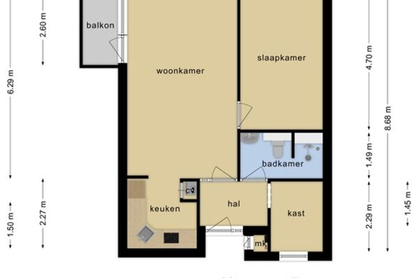 Het appartement heeft een lichte hal waaraan de woonkamer, badkamer en de inpandige berging grenzen. In de berging kun je veel spullen opbergen, waaronder de wasmachine en droger.