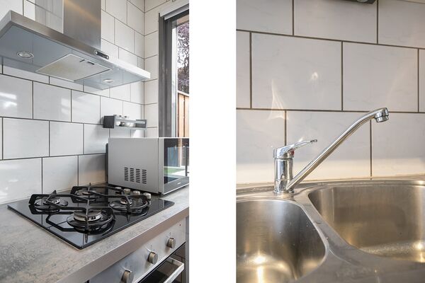 De keuken is volledig uitgerust met moderne apparatuur en biedt voldoende opbergruimte voor al je kookbenodigdheden. Inclusief vaatwasser, koelkast, vriezer, 4-pits gasfornuis, oven, magnetron en afzuigkap.
