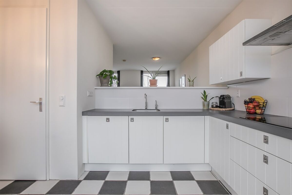 Vanuit de keuken heb je zicht op de ruime woonkamer door een aangepaste tussenmuur. Via de schuifpui in de keuken is er toegang tot het dakterras welke is gelegen op het zuiden. Vanwege de hoekligging van de woning heb je vrij uitzicht over de wijk.