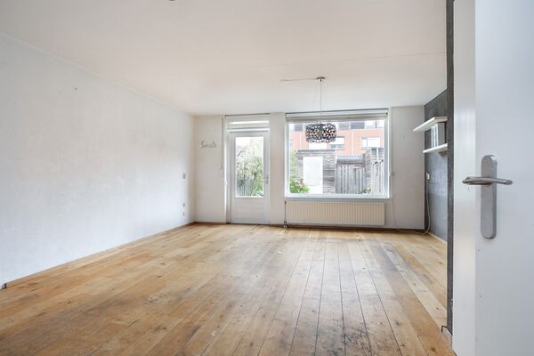 De woonkamer is een ruime, lichte leefruimte met een groot raam en een deur naar de achtertuin. Er is genoeg ruimte voor al je meubels: van je hoekbank tot en met de grote eettafel. Onder de kast is aan handige bergkast.