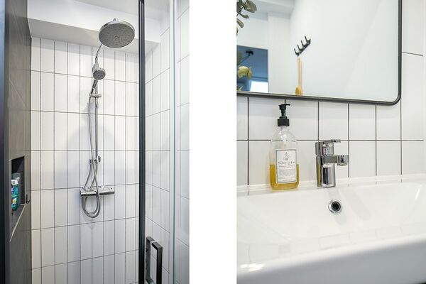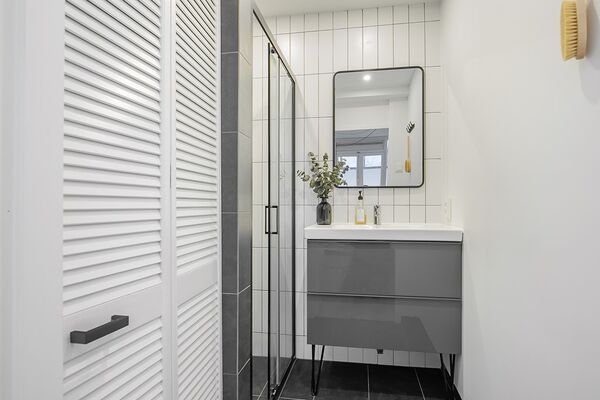 Het appartement heeft een ruime, sfeervolle slaapkamer met een mooie vloer-, wand- en plafondafwerking. Ook hier is de radiator voorzien van een ombouw en een houten vensterbank. In de slaapkamer is een deur naar de badkamer. Achter de witte louvredeuren is ruimte voor de wasmachine en verder is deze mooie badkamer ingedeeld met een inloopdouche en een wastafelmeubel. De wanden zijn deels gestuct en deels betegeld wat zorgt voor een sterk ruimtelijk gevoel.