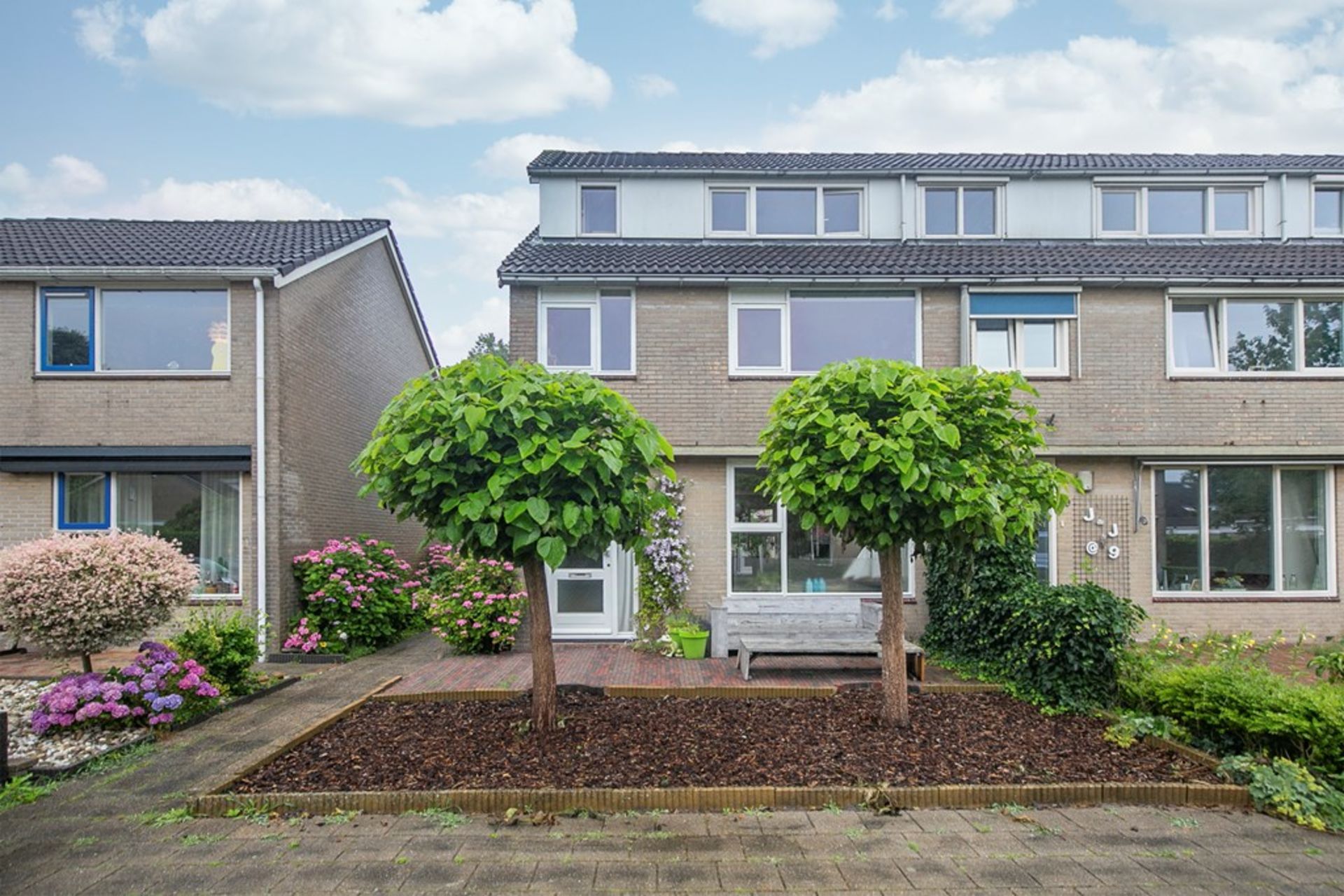 De onderhoudsarme voortuin grenst aan een grasveld. Het pad aan de zijkant en achterkant van het perceel leidt naar de achteringang. Drie andere buren maken ook gebruik van dit pad.