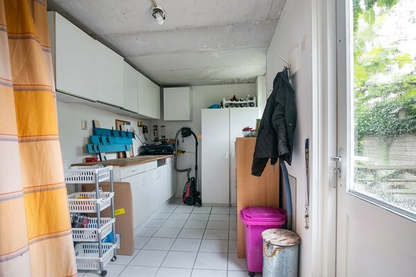 Aansluitend aan de keuken heeft de woning een ruime geïsoleerde bijkeuken met werkbank en kastjes. Daar is ook de CV-ketel. Deze is van december 2016 en heeft jaarlijks onderhoud gehad. De aansluiting van de wasmachine en de droger bevinden zich ook in deze bijkeuken.