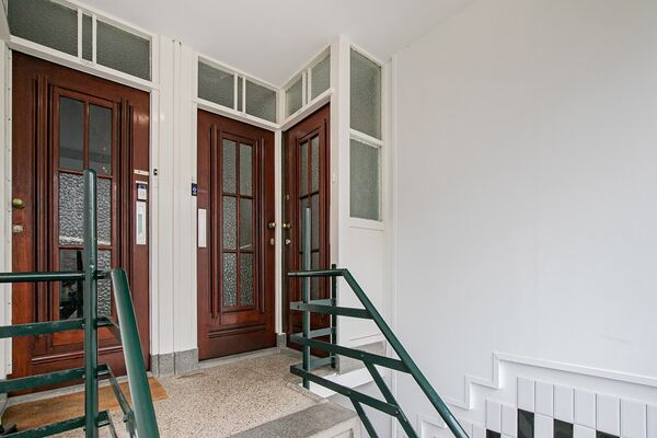 Entree vanaf een gezamenlijk portiek. Door middel van een gedeelde opgang bereik je de voordeur van het appartement.