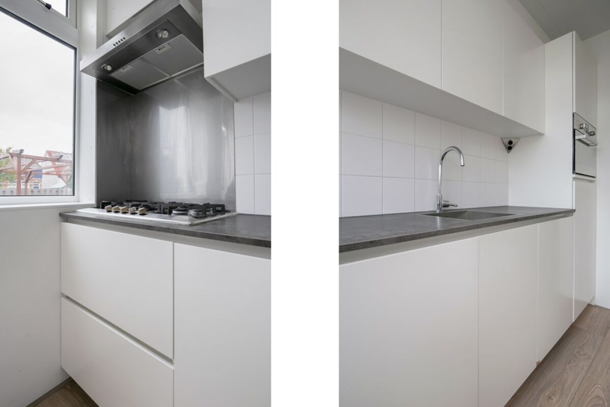 De entree leidt tot de hal met de trapopgang, een opbergruimte (onder de trap) en toegang naar de woonkamer en de keuken en een toilet. De doorzonwoonkamer heeft aan beide zijden twee grote ramen en voelt fijn ruim aan door het hoge plafond. De vloer is afgewerkt met laminaat. De dichte keuken is bereikbaar vanuit de gang en is voorzien van twee strak afgewerkte keukenblokken met diverse inbouw apparatuur. Onder een van de keukenblokken bevinden zich de kasten waarin een regulier formaat wasdroger en wasmachine passen. Ook bevindt zich, mooi afgewerkt, de CV-ketel en de achterdeur naar de tuin. De achtertuin op het noorden met achterom heeft ’s middags en ’s avonds voldoende zon om van te kunnen genieten en beschikt over een ruime, houten berging.