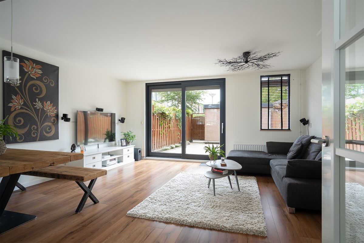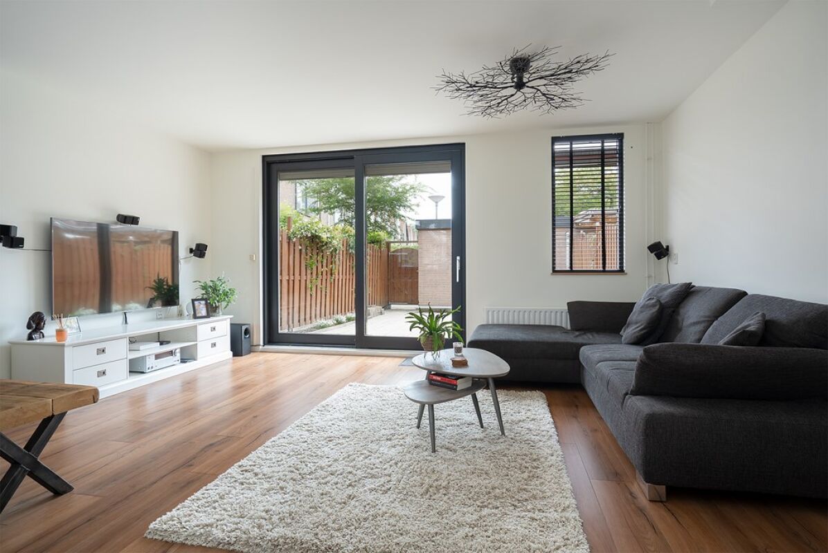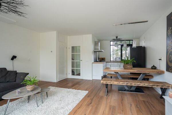 - De woonkamer is aan de achterzijde gelegen, voorzien van een laminaatvloer. Tevens is er toegang tot een trapkast, ideaal voor extra bergruimte! D.m.v.