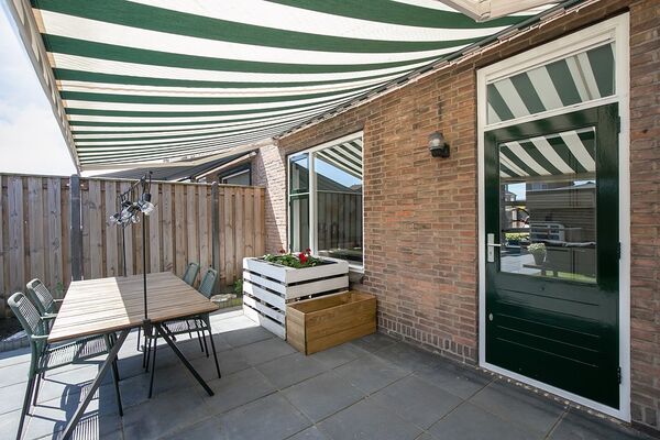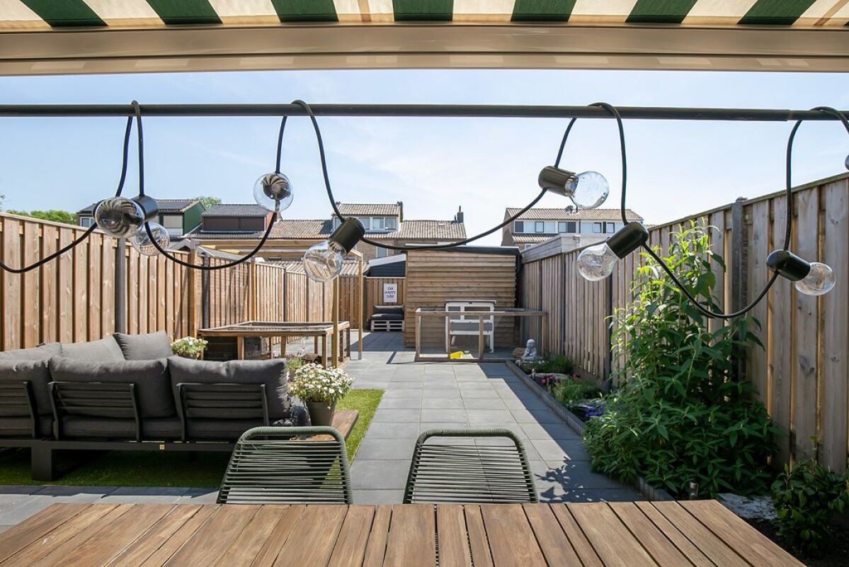Vanuit de keuken stap je de achtertuin in, gesitueerd op het oosten. Hier zie je een grote buitenruimte met grote betontegels, kunstgras, een borders met lage beplanting en houten schuttingen. Dankzij de diepte van de tuin kun je de hele dag in de zon zitten. Tegen de achtergevel hangt buitenzonwering en in de ruime berging is ruimte voor de fietsen en het tuin-/klusgereedschap. Via de poort is de achtergelegen steeg te bereiken.