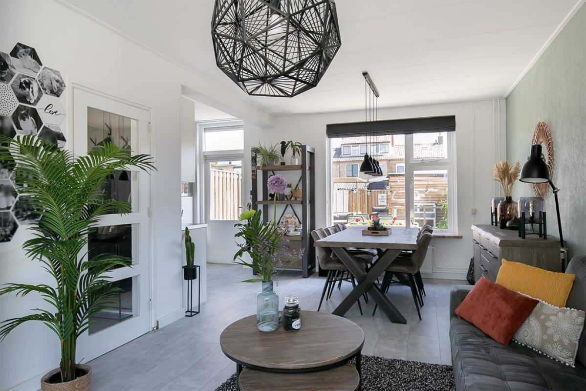 Open de vernieuwde deur met glas vanuit de hal naar de woonkamer. Je ziet een gezellige leefruimte met een open keuken, grote ramen aan de voor- en achterzijde en een fantastische sfeer. Er is genoeg ruimte voor een grote hoekbank, dressoir, servieskast en een eettafel.