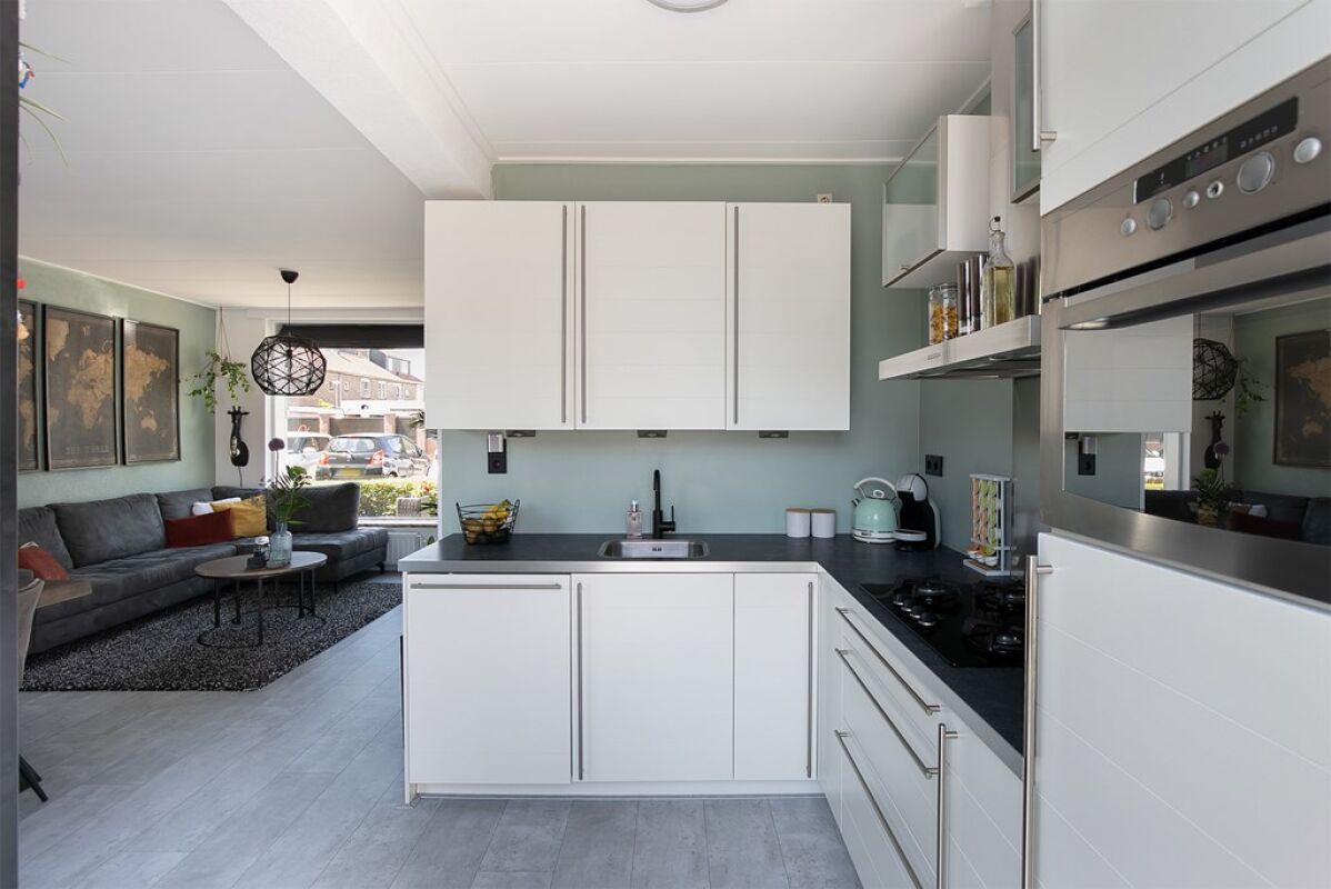 De halfopen keuken heeft een grote hoekopstelling met brede lades, hoge kasten, een donker werkblad en goede verlichting. Alle benodigde apparatuur is ingebouwd: een gaskookplaat, afzuigkap, vaatwasser, koelkast met vriesvak en een combi-oven/magnetron. In de keuken is de deur naar de achtertuin.