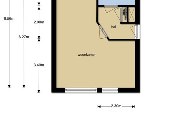 De woning bestaat uit één woonlaag met een entreehal met een meterkast en de ingang naar de badkamer en de woonkamer. De badkamer is voorzien van een inloopdouche met thermostaat kraan, toilet en een wastafel met onderkast. De woonkamer is L-vormig en de muren zijn behangen met glasvezelbehang. De keuken is voorzien van een keukenblok met een keukenkraan. Vanuit de keuken loop je de slaapkamer in. Dit was de inpandige berging die bij de woning is getrokken, waardoor er een aparte slaapruimte is gecreëerd. De slaapkamer is voorzien van een ingebouwd bed met daaronder extra bergruimte. Aan de andere kant van de keuken is er de tweede toegangsdeur naar de eigen buitenruimte.