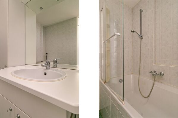 De volledig betegelde badkamer (ca 6 m3) heeft een ligbad/douchecombinatie, wastafelmeubel en aansluiting voor de wasmachine.
