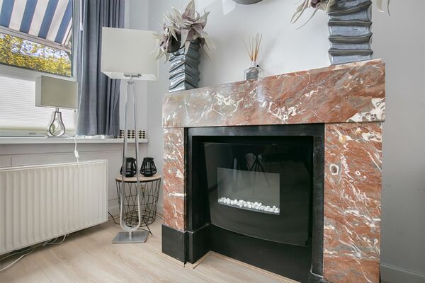 Na voorportaal links de woonkamer met marmeren schouw en sfeerhaard (blijft achter).