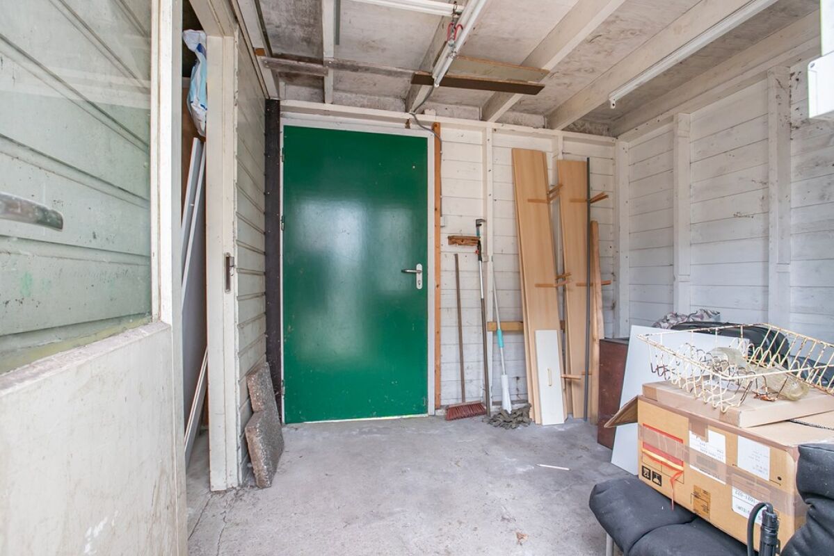 De achtertuin is opgeruimd en ontruimd in afwachting van de beslissing van de nieuwe eigenaar. Er liggen nog genoeg tegels die hij kan gebruiken als hij dat wil. De voorkant van het grote schuurtje is volledig gerenoveerd.