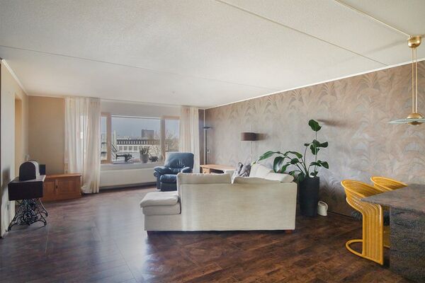 Rechts in de hal is een deur naar de sfeervolle woonkamer met een deur naar het balkon en grote ramen aan de zuidwestkant. Opvallende elementen zijn de parketvloer, het behang op de lange wand en de zwarte schuifdeuren naar de hoofdslaapkamer.