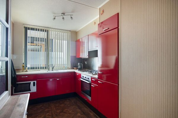 Via het eetgedeelte is de keuken te bereiken, waar een hoogglans rode hoekopstelling staat. Alle apparatuur is ingebouwd: een gaskookplaat, afzuigkap, oven, magnetron en een koel-/vriescombinatie.