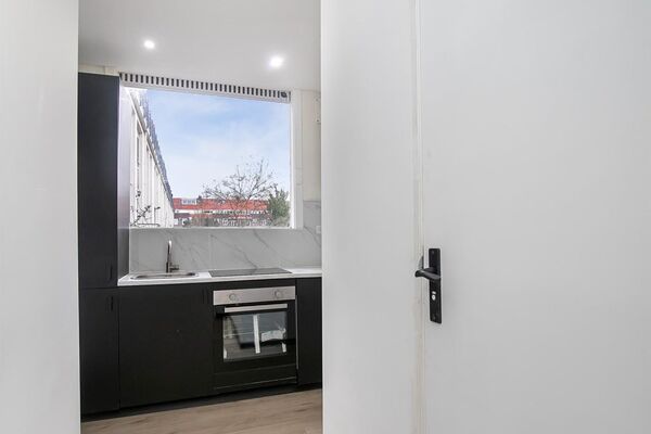 Vanuit de hal is ook de moderne, halfopen keuken bereikbaar. De keuken is uitgerust met diverse inbouwapparatuur, waaronder een koel-vriescombinatie, oven, inductiekookplaat en vaatwasser. De praktische indeling en toegang tot de tuin maken deze keuken ideaal voor kookliefhebbers.