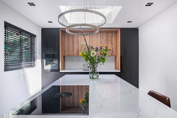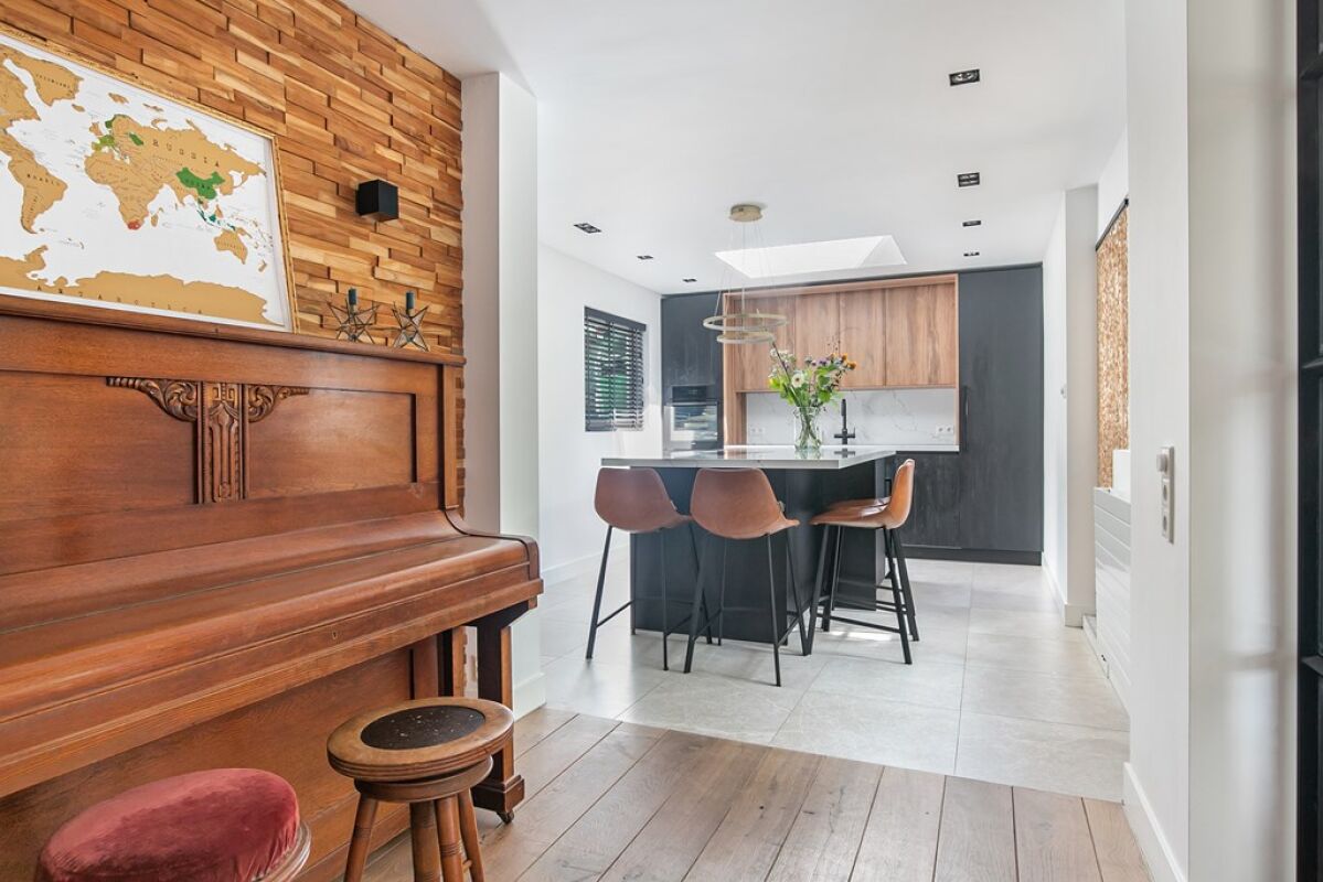 De hal leidt naar de luxe woonkeuken met kookeiland. Deze keuken, geplaatst in 2022, is van alle gemakken voorzien zoals bijvoorbeeld inductie kookplaat, ingebouwde stoomoven, wijnkoelkast en meer...(Kitchen Studio).