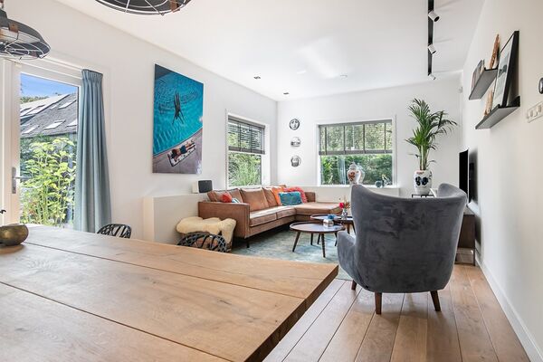 De woonkamer is voorzien van een mooie houten vloer (eiken) en veel ramen wat zorgt voor een fijne lichtinval. Door het goed uitgevoerde lichtplan ís de woning ook 's avonds bijzonder sfeervol in zowel keuken als woonkamer.