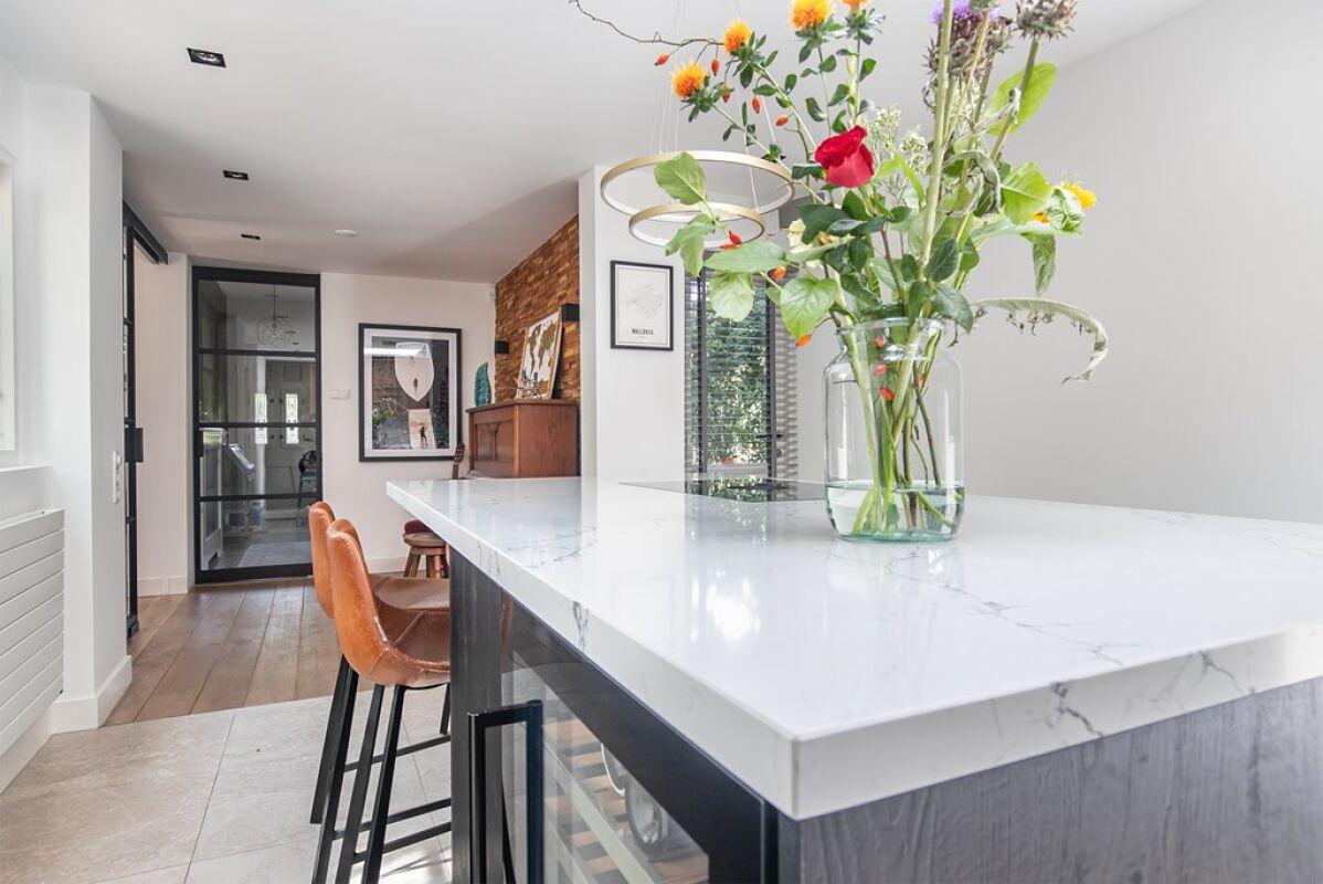 The hall leads to the luxurious kitchen/diner with cooking island. This kitchen, installed in 2022, is fully equipped, with amongst others an induction cooker, built-in steam oven, wine refrigerator and more... (Kitchen Studio).