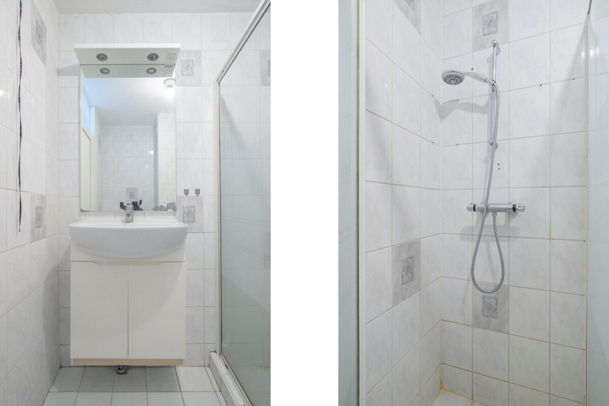 De naastgelegen, nette badkamer is geheel betegeld en voorzien van een hang toilet, wastafelmeubel en douche, tevens een aansluiting voor witgoedmachines.