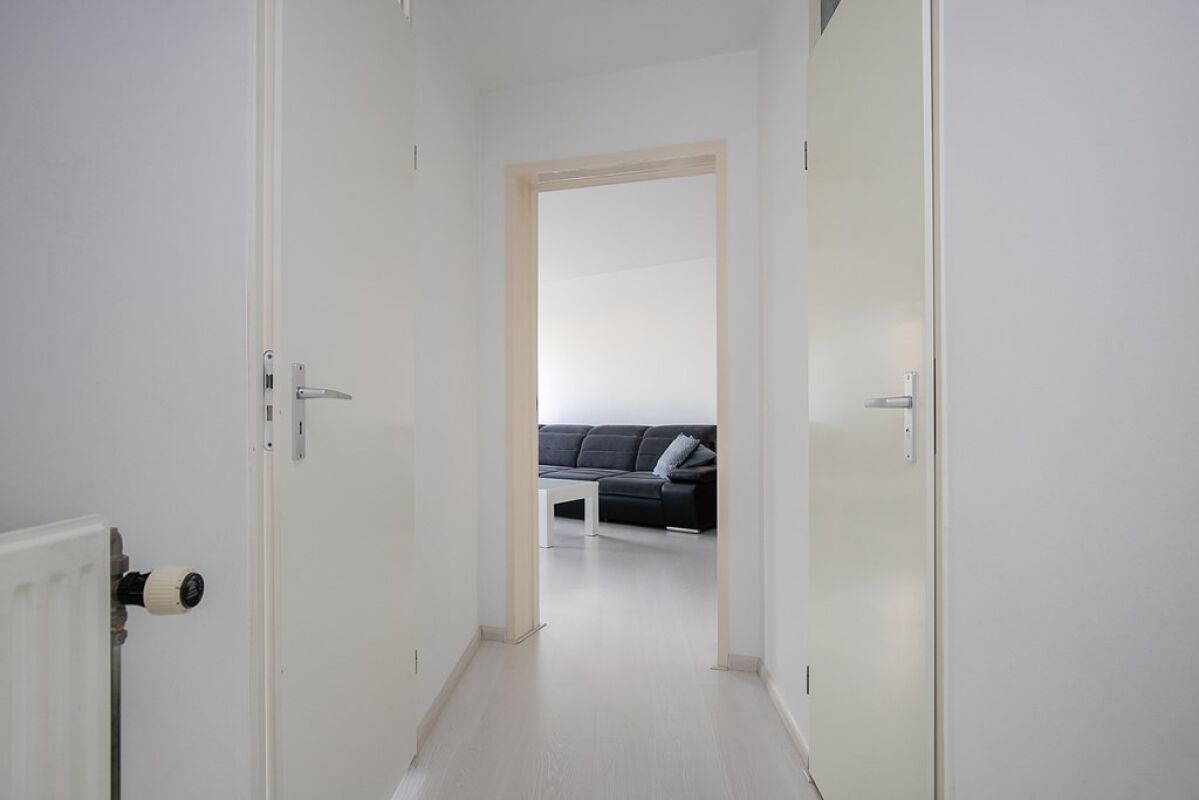 Achter de voordeur gaat een speels ingedeeld, goed onderhouden appartement verscholen met twee slaapkamers en een ruime woonkamer met open keuken. In nagenoeg het hele appartement ligt een witte laminaatvloer en zijn zowel de wanden als plafonds in een lichte kleur geschilderd.