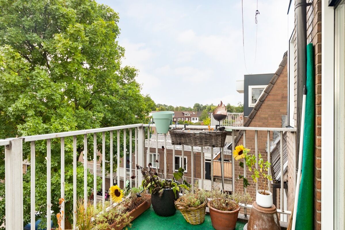 Als we dan doorlopen komen we bij de drie slaapkamers uit. De eerste kamer ligt aan de voorkant en heeft een dakraam. De andere twee kamers liggen aan de achterkant waarvan er een kamer een schuifpui heeft naar het balkon. En dat balkon ligt heerlijk op de zon, nagenoeg volledig op het zuiden.