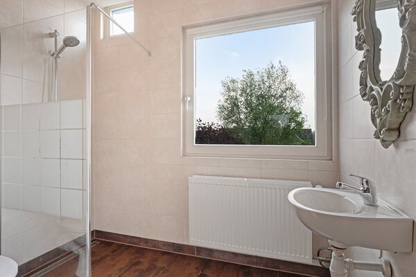 Aan uw linkerzijde is een badkamer van circa 6m2 met veel lichtinval, met douchecabine, wastafel en staand closet. De wanden zijn voorzien van tegelwerk, het plafond is voorzien van spuitwerk en een privacy vriendelijke paneeldeur met gematteerd glas. Er is een raamkozijn met tuimelraam.