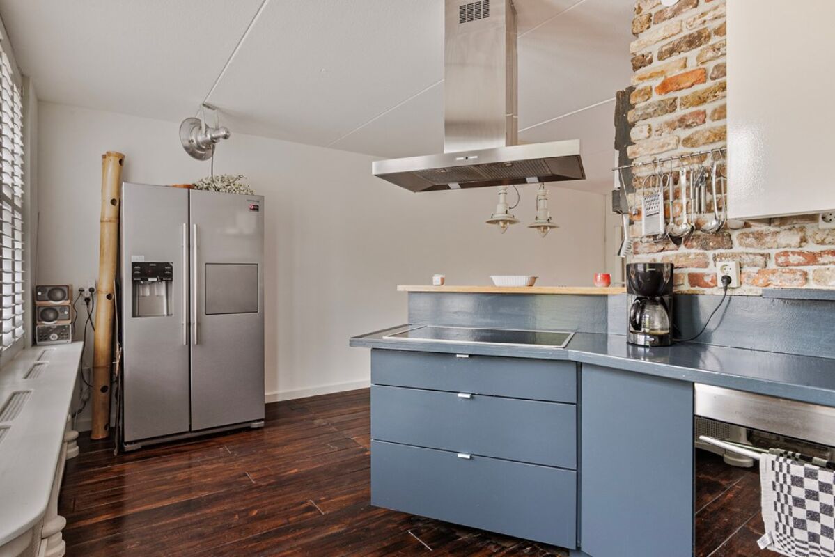 De achterzijde van de kamer staat direct in verbinding met de open keuken. De keuken staat in een hoekopstelling en is uitgevoerd in een lichte- en donkere kleurstelling. De keuken is voorzien van zwevende rvs afzuigkap en semi-kookeiland. Het massief houten aanrechtblad is voorzien van een dubbele spoelbak, inductiekookplaat en oven.