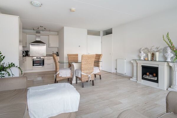 De licht uitgevoerde keuken is opgesteld in een L-opstelling met natuurstenen keukenblad en is voorzien van diverse inbouwapparatuur; vaatwasser, gasfornuis, RVS-afzuigkap.