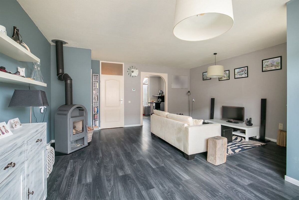 Entree en hal met garderobe, ruime woonkamer met trappenkast en een houtkachel. De half openkeuken met de essentiële inbouw apparatuur bied toegang tot de tuin. De keukeninrichting voorzien van een keramisch kookplaat, combioven, magnetron, koelkast, vriezer en vaatwasmachine. De gehele begane grond is voorzien van een laminaat vloer. De voormalige berging is omgebouwd en kan gebruikt worden als kantoor met aparte ingang en toegang naar de tuin, ook is er de mogelijkheid voor een extra slaapkamer op de begane grond.
