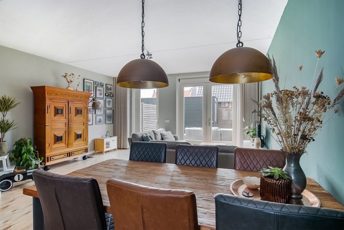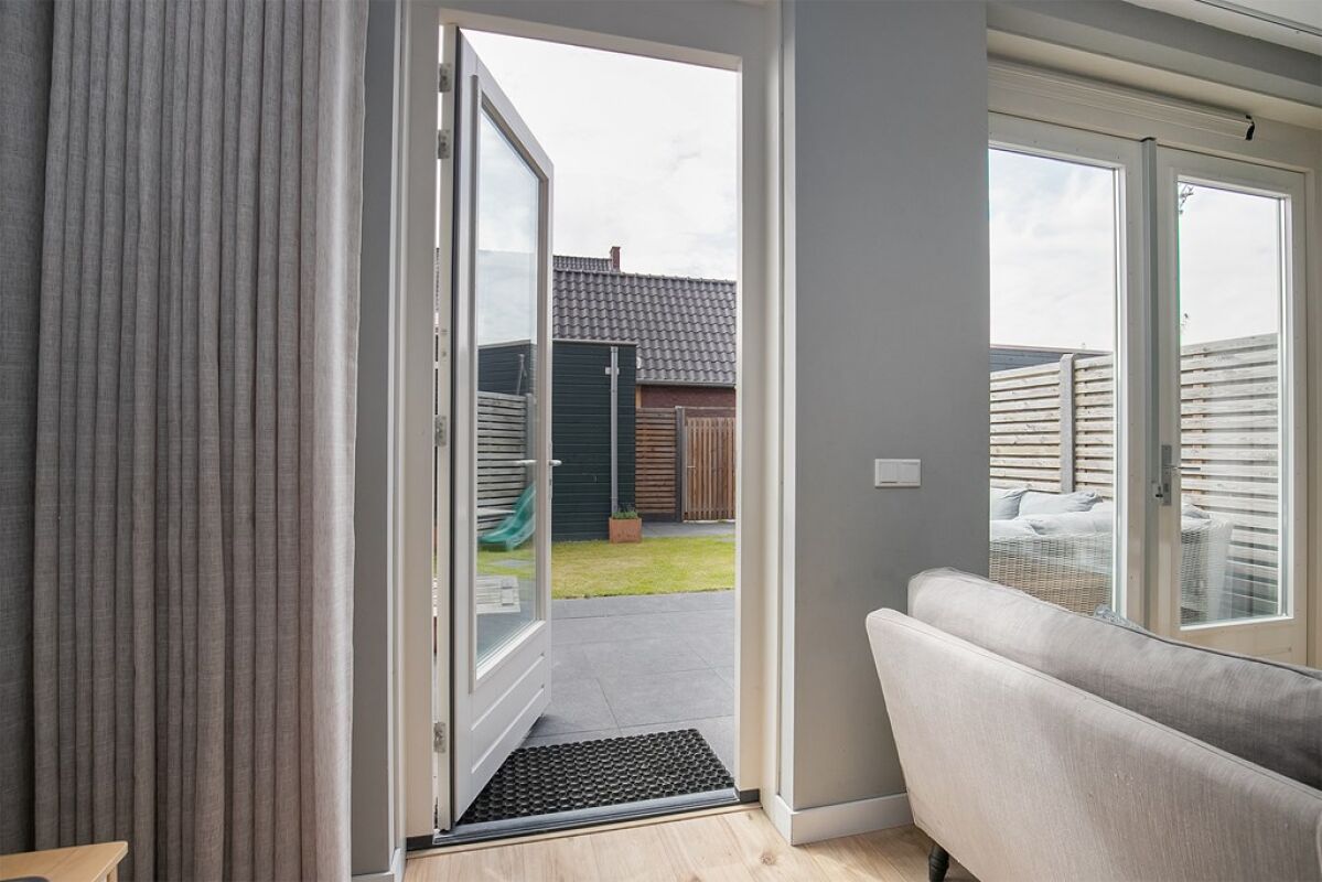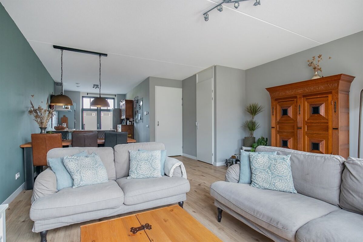 De woonkamer (ca. 28 m2) aan de achterzijde met zicht op de achtertuin en open verbinding met de keuken aan de voorzijde. Trapkast met bergruimte en verdeler van de vloerverwarming. Via de dubbele tuindeuren en de achterdeur is de tuin bereikbaar.