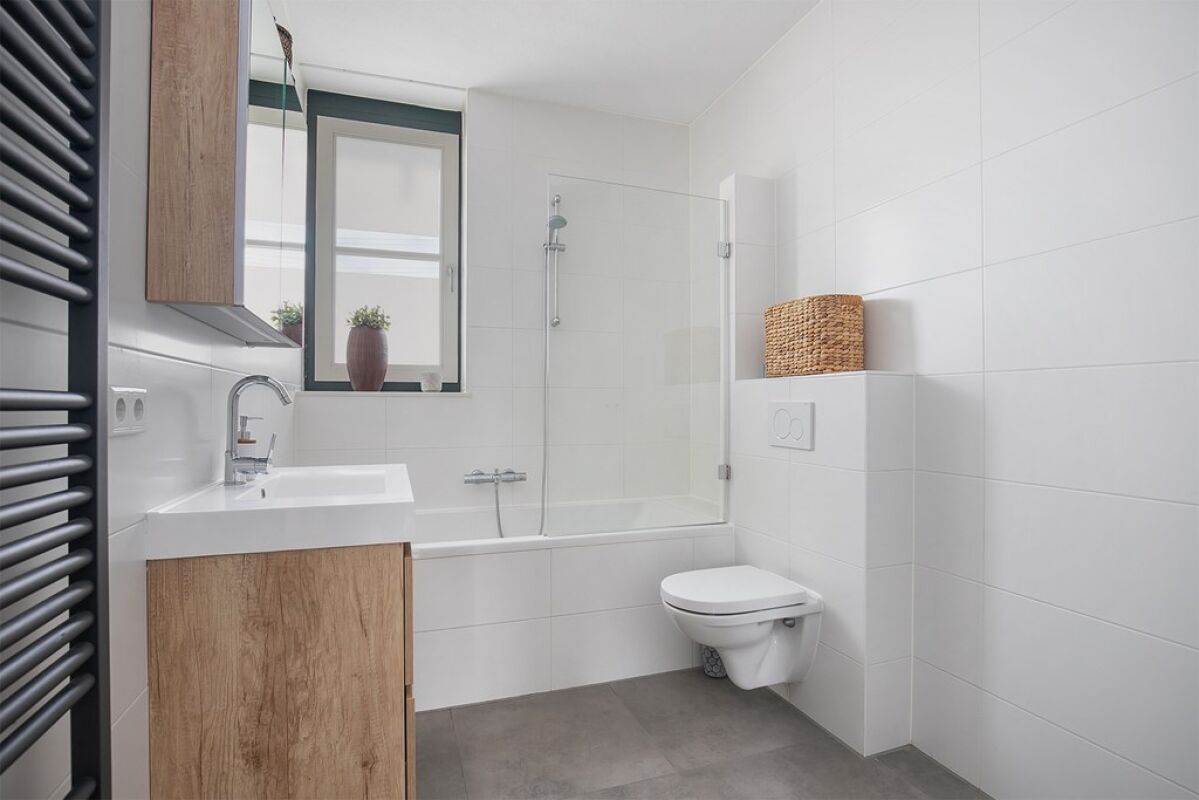 Badkamer (ca. 6 m2): gelegen aan de voorzijde en voorzien van grijs en wit tegelwerk, 2de toilet, ligbad, voorbereiding voor een inloopdouche, wasmeubel, design radiator en ventilatieraam.
