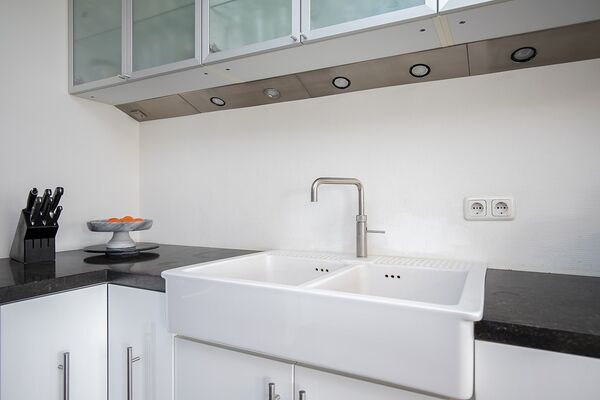 • De keuken is voorzien van een Belgisch hardstenen aanrechtblad, fornuis (90 cm) met dubbele oven, combimagnetron, grote koelkast, vriezer en vaatwasmachine