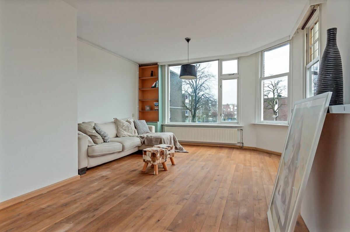 De woonkamer heeft het allemaal; een mooie houten vloer, hoog plafond, glas-in-loodramen en mooi lichtinval via de ramen aan de Spinozastraat en de Repelaerstraat. De wanden en het plafond zijn strak afgewerkt zodat je niet hoeft te starten met een grootschalige verbouwing. Achter de en-suite deuren is een ruimte die je kunt gebruiken als slaapkamer.