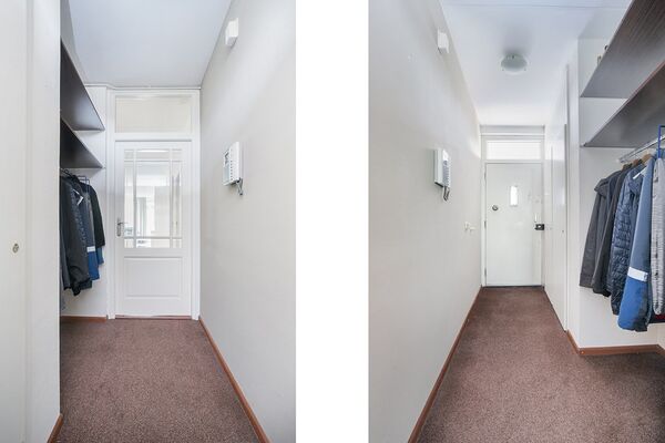 Aan het begin van de galerij (geen doorloop) is de voordeur van dit ruime appartement. Links in de hal zijn de meterkast, een bergkast en de garderobenis. Op de vloer ligt een droogloop tapijt en dankzij de luxe video-intercom kun je niet alleen horen, maar ook zien wie beneden aanbelt.