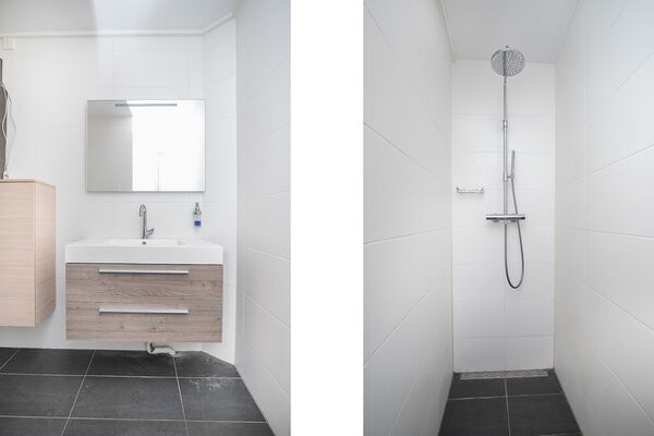 Rechts in de woonkamer is een deur met glas naar de tweede hal waaraan de slaapkamers, badkamer, toiletruimte en twee grote inbouw-/garderobekasten grenzen. De moderne toiletruimte is ingedeeld met een wandcloset en fonteintje. Ook de badkamer met inloopdouche, wastafelmeubel, twee hoge kasten en spiegel met verlichting is geheel vernieuwd.