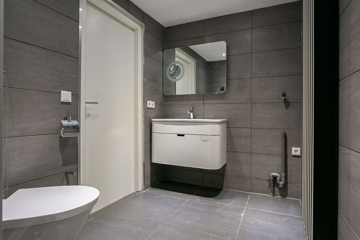 De keuken is voorzien van leuke wandtegels, een keramische kookplaat en een afzuigkap. Op de begane grond is de ruime badkamer met inloopdouche, toilet, wasmachineaansluiting en een wastafel. Zowel de wanden als de vloer zijn voorzien van donkergrijze tegels en het plafond heeft inbouwverlichting.