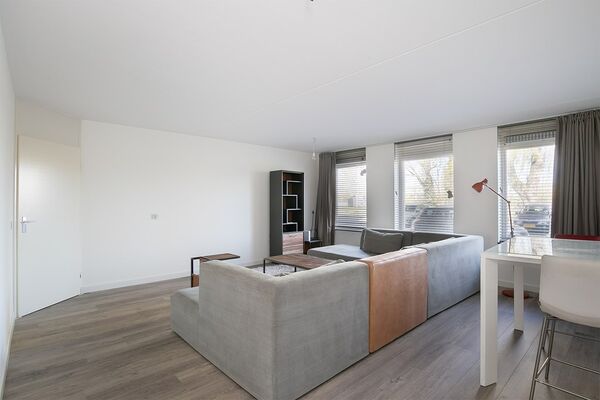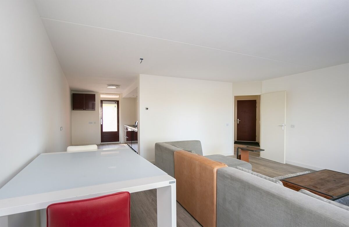 Aan de voorzijde van dit instapklare appartement is de ruime woonkamer met drie grote ramen, laminaat op de vloer en genoeg plek voor een eettafel, kast en een hoekbank. In de hoek van de woonkamer is de toegang tot de keuken met een hoogglans wandopstelling met alle benodigde inbouwapparatuur: een keramische kookplaat, vaatwasser, koelkast en een combimagnetron. De kleuren donkerrood en zwart geven de keuken een luxe uitstraling. De deur in de keuken geeft toegang tot de tuin.
