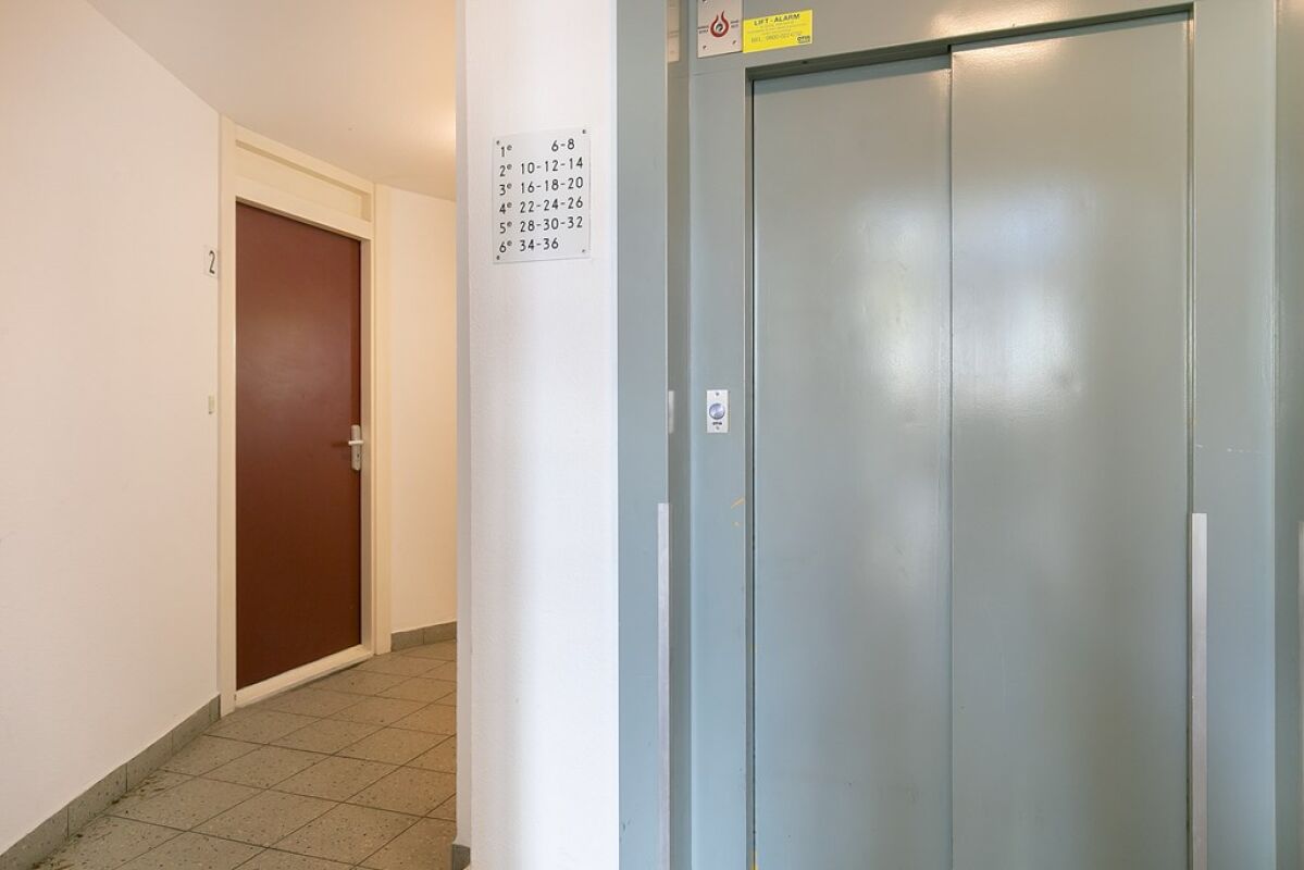 Op de hoek van het gebouw is de afgesloten entree van waaruit de verschillende woonverdiepingen te bereiken zijn. Dit appartement is op de begane grond gesitueerd, net als de privé berging waar ruimte is voor de fiets.