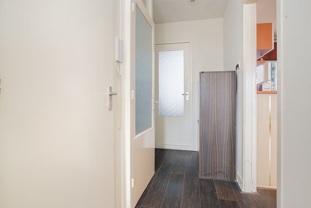 Toegang via afgesloten portiek met brievenbussen naar de 1e verdieping; entree appartement; hal met meterkast; trapopgang naar de 2e verdieping met vliering en opstelling cv-combiketel (Intergas HR februari 2017); hal met betegelde toilet en fontein; woonkamer ca. 3,40 deels 3,20X9,60m voorzien van laminaatvloer en open keuken met kookplaat, afzuigkap, vaatwasmachine en schuifpui naar achterbalkon ca. 1,00X2,75m; voorslaapkamer ca. 4,05X4,10m met kastenwand en toedang tot voorbalkon; achterzijkamer ca. 2,25X4,05m met laminaatvloer; geheel betegelde badkamer ca. 1,70X2,85m voorzien van inloopdouche.