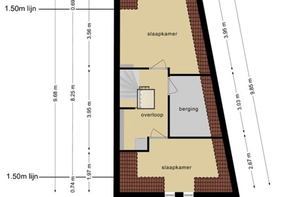 Bereikbaar via de vaste trap treft u de overloop met de opstelling voor het witgoed. Verder bevinden zich hier twee slaapkamers en een kleine berging.