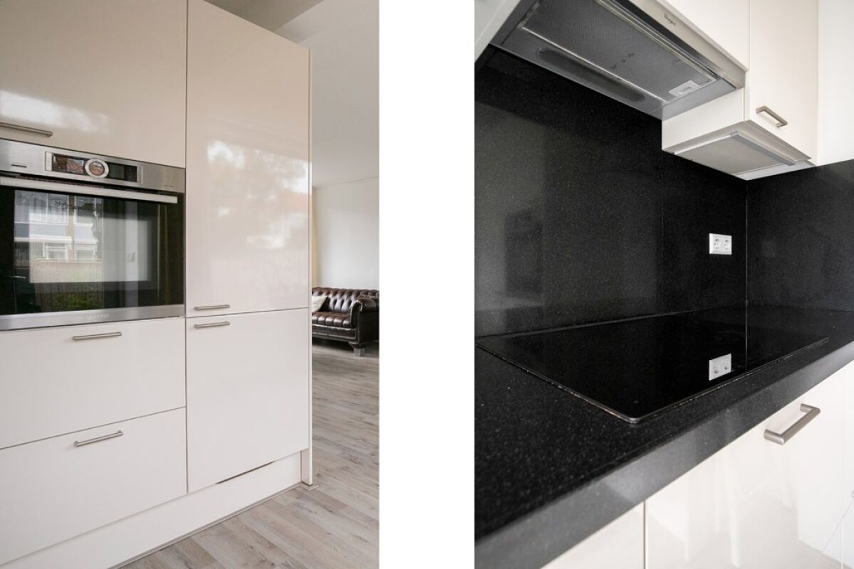 Entree, ruime hal met meterkast, toilet, kelderkast, toegang tot woonkamer en trapopgang. Moderne sfeervolle woonkamer ca. 3.7x 6.9 m met doorgang naar openkeuken. Open geheel vernieuwde keuken van ca. 2.3x2.8 m met veel lichtinval en luxe keukeninrichting voorzien van een inductie kookplaat, combimagnetron, koelkast, vriezer en vaatwasmachine. De gehele begane grond is voorzien van een laminaatvloer.