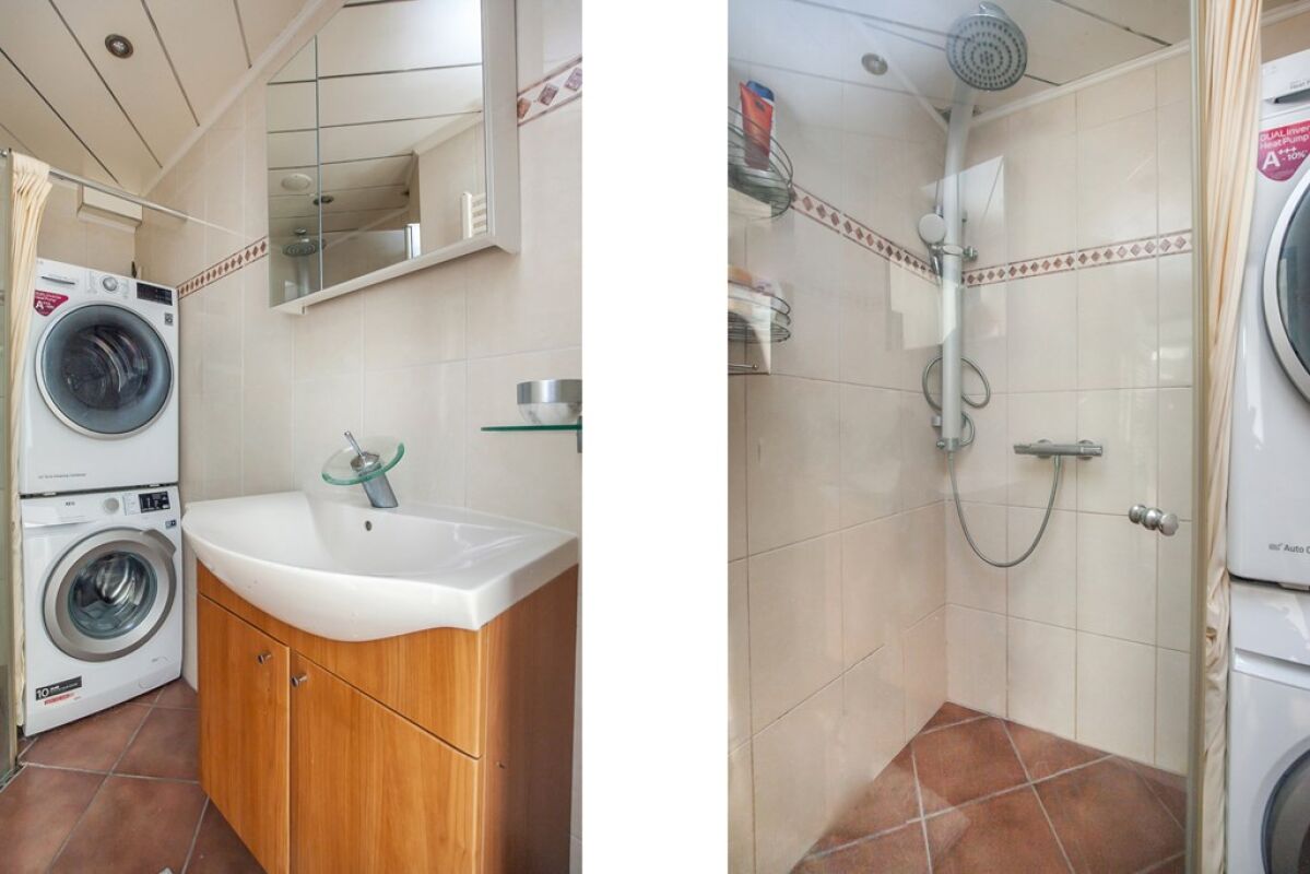 CV ketel praktisch weggewerkt in opbergkast. Inbouwspots muziek in keuken en badkamer.