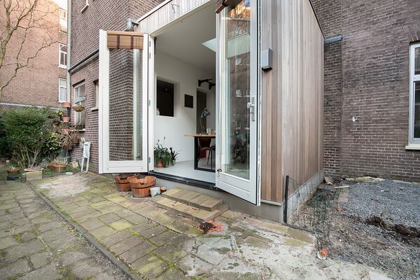 Aan de achterzijde van de woonkamer ligt de leef of werkkamer. Dit is een in 2018 in de tuin aangebouwde kamer van ongeveer 9m2 voorzien van een dakraam en grote glazen pui met naar de tuin toe dubbele openslaande deuren. Dit zorgt voor heel veel licht inval en een hele prettige plek om het hele jaar door te zitten. De industrieel uitziende gietbeton vloer is voorzien van vloerverwarming. De openslaande deuren geven direct toegang tot een stuk eigen tuin en de enorme binnentuin. Deze aanbouw is ontworpen door een professionele architect en gerenommeerde aannemer, tevens is de aanbouw volledig met vergunning van de gemeente Amsterdam en met toestemming van de VVE gebouwd. Leuk detail is dat deze uitbouw de eerste was in het complex, waarna enkele anderen volgden, wat een mooie moderne look geeft aan het geheel wanneer je door de tuin loopt.