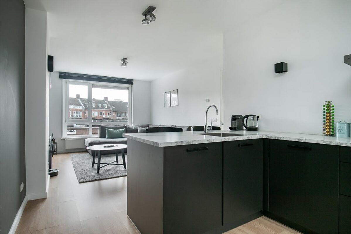 Links van de slaapkamer, het pareltje van dit appartement, de ruime woonkamer met open keuken en openslaande deuren naar het balkon. De keuken is voorzien van een vaatwasser, combimagnetron (oven) en koel-vriescombinatie.