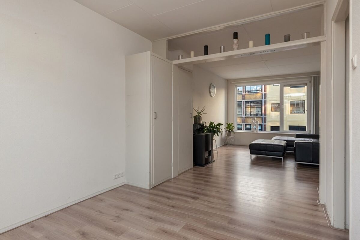 Kom binnen in dit leuke appartement; de hal heeft een praktische vaste kast en geeft toegang tot de woonkamer, keuken, doucheruimte, badkamer en de toiletruimte. Je ziet direct de mooie combinatie tussen paneeldeuren, schilderwerk in lichte kleuren en een mooie laminaatvloer; deze afwerking vind je in een groot deel van het appartement terug.