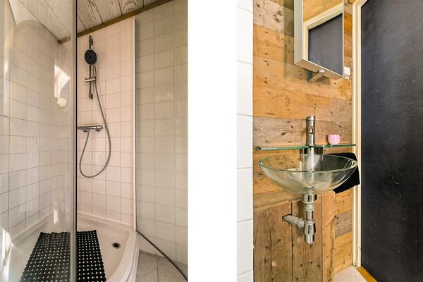 Tussen de woonkamer en de keuken is de badkamer, te bereiken vanuit de hal en ingedeeld met een kwartronde douche, een glazen waskom en een toilet.
