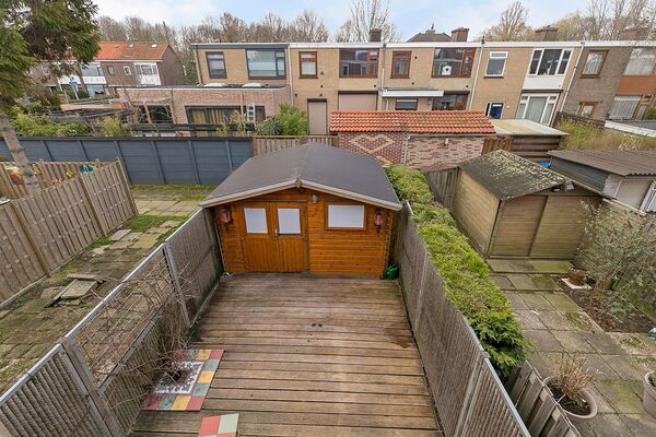 De voortuin is eenvoudig aangelegd met twee verhoogde borders en de rest van de ondergrond is afgedekt met houten vlonderplanken. De achtertuin ligt op het zonnige zuiden, heeft vernieuwde erfafscheiding van kokos, achterin de tuin staat een ruime houten berging en er is een groot terras van houten vlonderplanken.