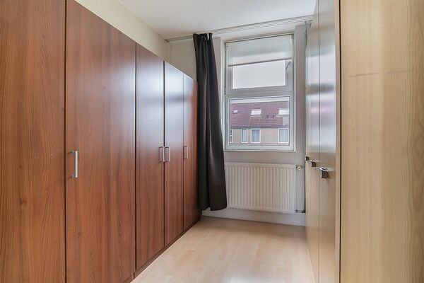 Tweede verdieping: een vaste trap geeft toegang tot de overloop op de tweede verdieping. Hier hangt de cv-ketel en heb je bergruimte in de schuinten van het dak. Aansluitend is de vierde slaapkamer met een groot dakraam en bergruimte achter de knieschotten. Het dak met hoge nok is geïsoleerd en deze kamer is nu ingericht als werkkamer. Qua ruimte is het mogelijk om deze kamer te verbouwen met twee kinderkamers als resultaat.