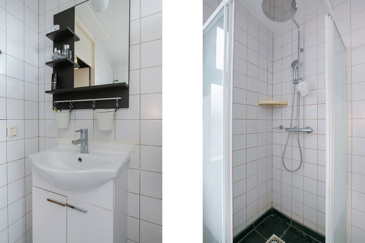 De badkamer heeft een groot raam in de voorgevel, verwarming en ruimte voor zowel de wasmachine als droger. Verder zie je in de badkamer een wastafelmeubel, douche en een tweede toilet.